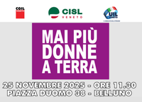 In occasione della Giornata Internazionale per l’eliminazione della violenza contro le donne, martedì 25 novembre 2025, Cgil, Cisl e Uil Veneto danno vita a un flash mob in piazza Duomo a Belluno. L’appuntamento con l’iniziativa, dal titolo “Mai più donne a terra, mai più violenza”, è per le ore 11.30 davanti alla Prefettura.